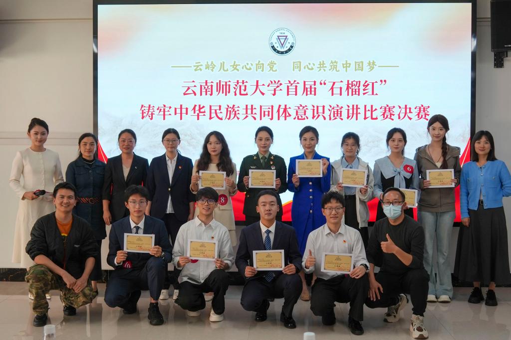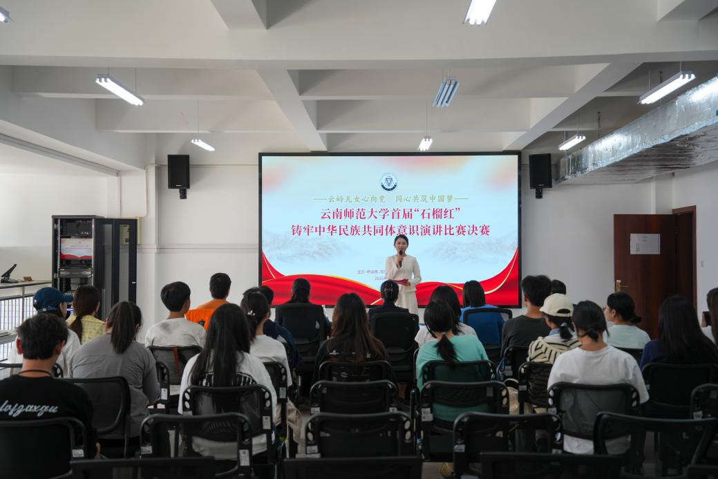 为深入学习宣传贯彻习近平新时代中国特色社会主义思想,引导广大师生进一步铸牢中华民族共同体意识,2025年10月14日下午,由云南师范大学党委统战部、团委、马克思主义学院联合主办的首届“石榴红”铸牢中华民族共同体意识演讲比赛决赛在呈贡校区东区学生实训中心南楼举行。